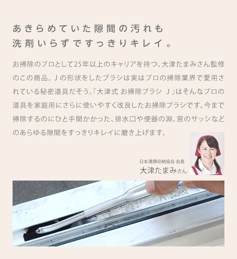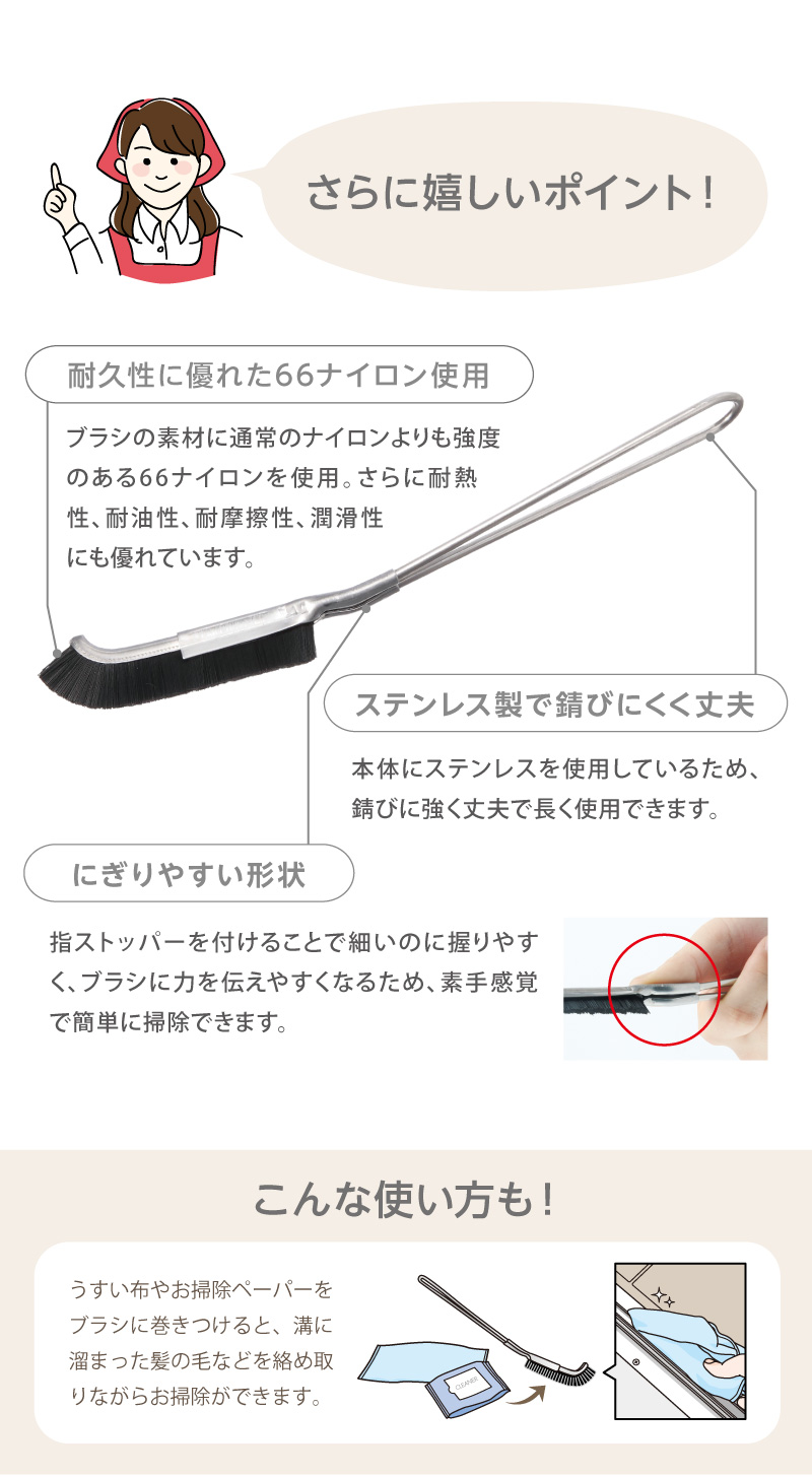 1. 先端が「Jの字」になっているので今までの掃除ブラシでは届かなかった場所も掃除できる。