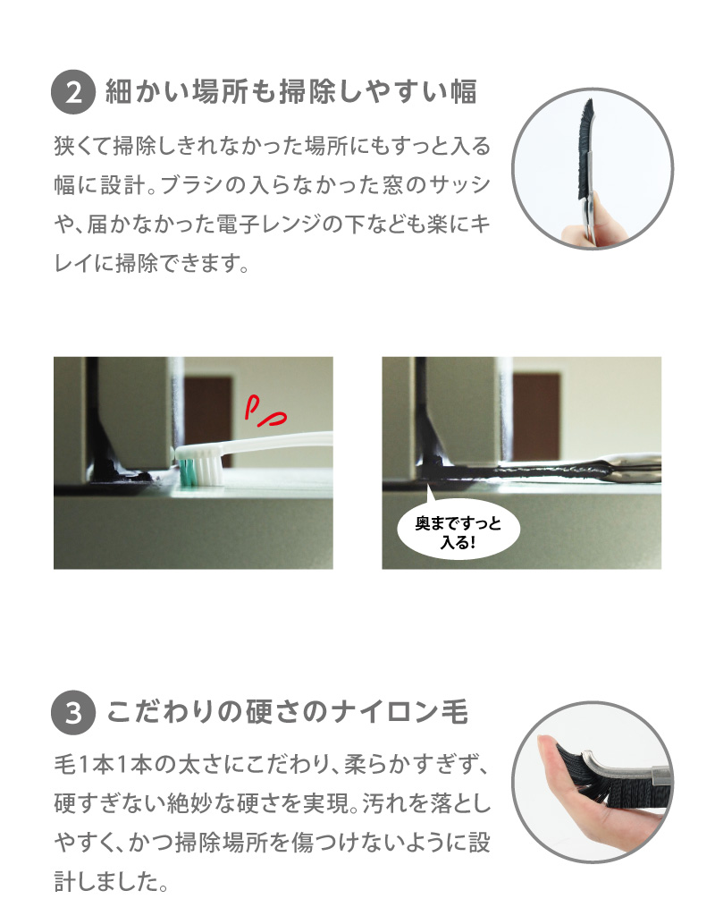2.ブラシの毛1本1本の太さにこだわり柔らかすぎず、硬すぎずの絶妙な硬さに設計。(汚れはとれるが掃除場所を傷つけない硬さ)