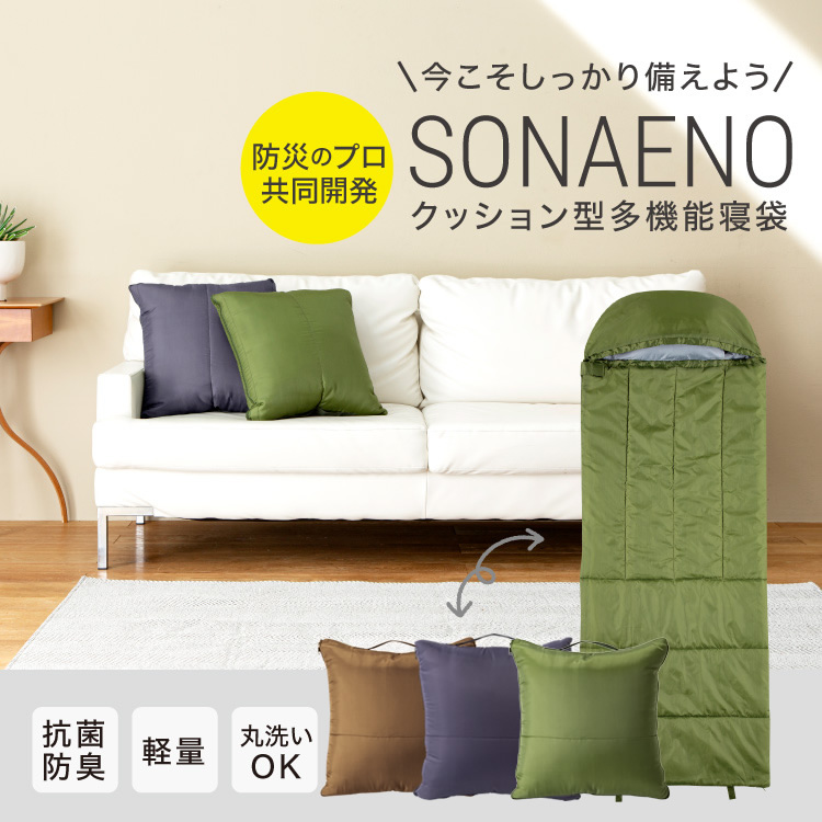 避難生活での睡眠環境の確保に役立つ寝袋を、普段使いもできるクッション型収納に。