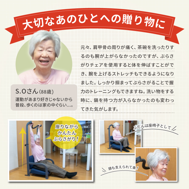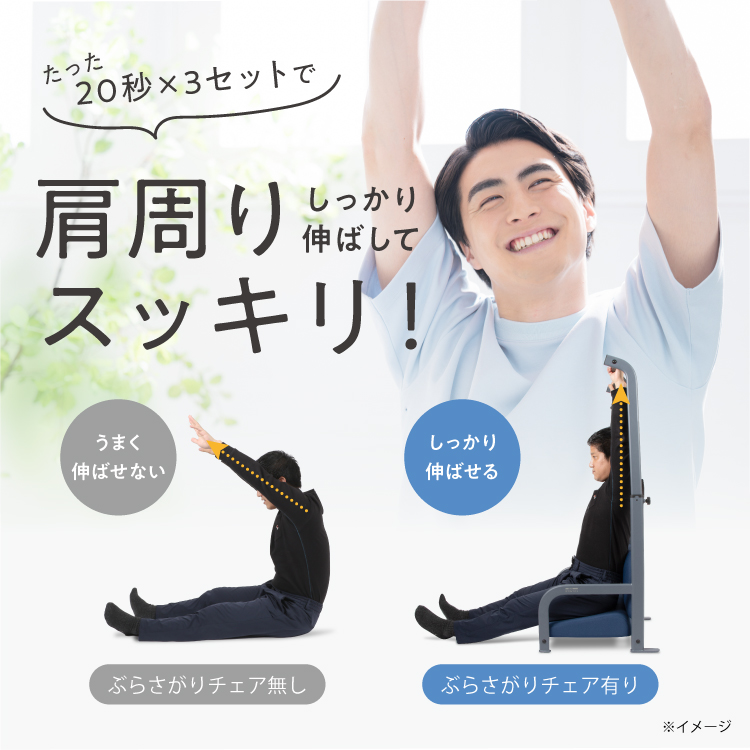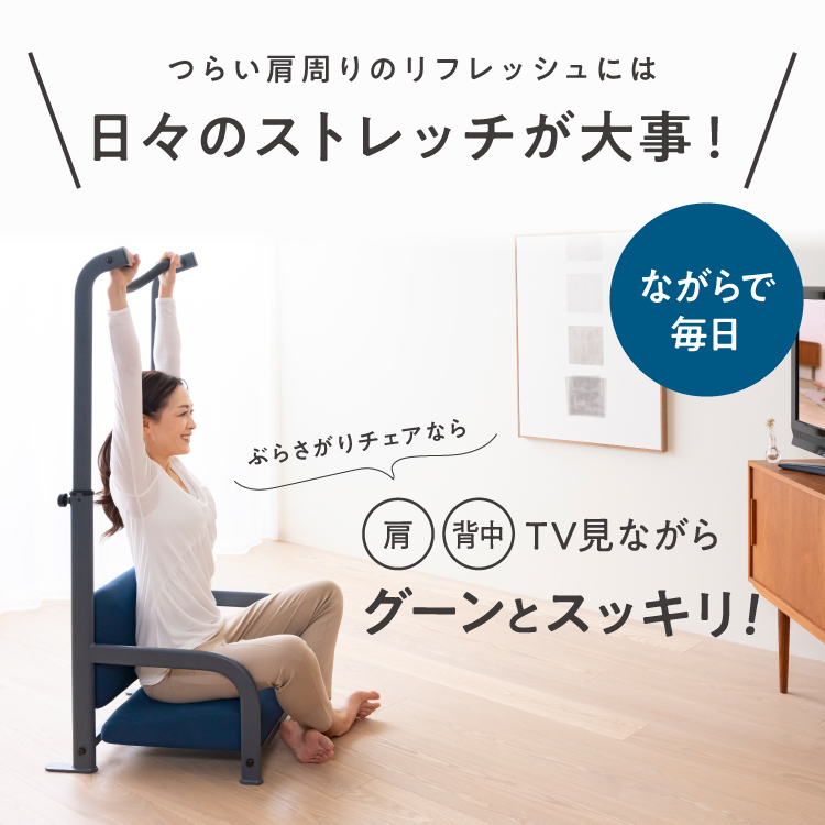 ぶらさがりチェアは腕が完全に上方向にあがるため、普段動かさない可動域まで肩を動かすサポートができます。