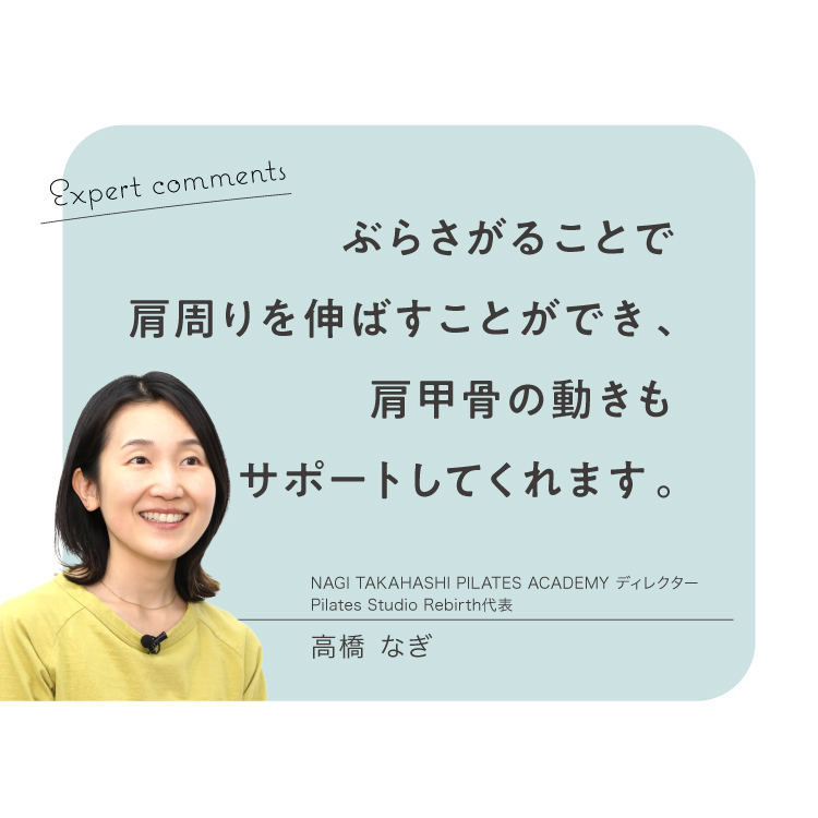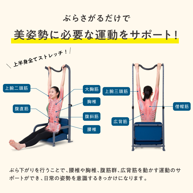 ぶら下がりを行うことで腰椎や胸椎、広背筋を動かす運動のサポートができるため、美姿勢な身体つきを後押しすることができます。