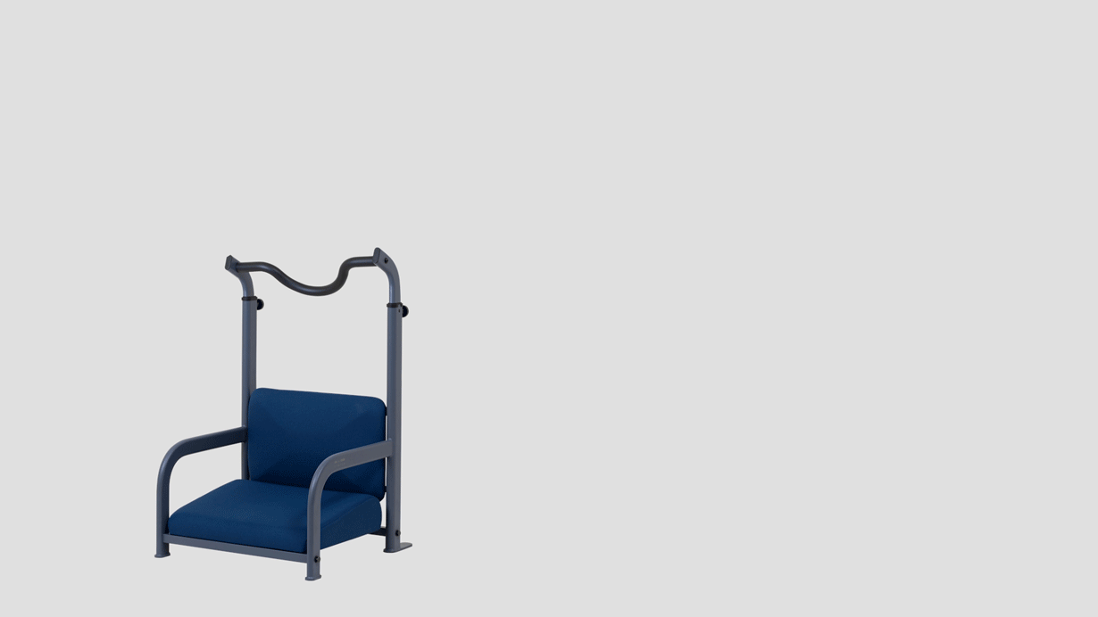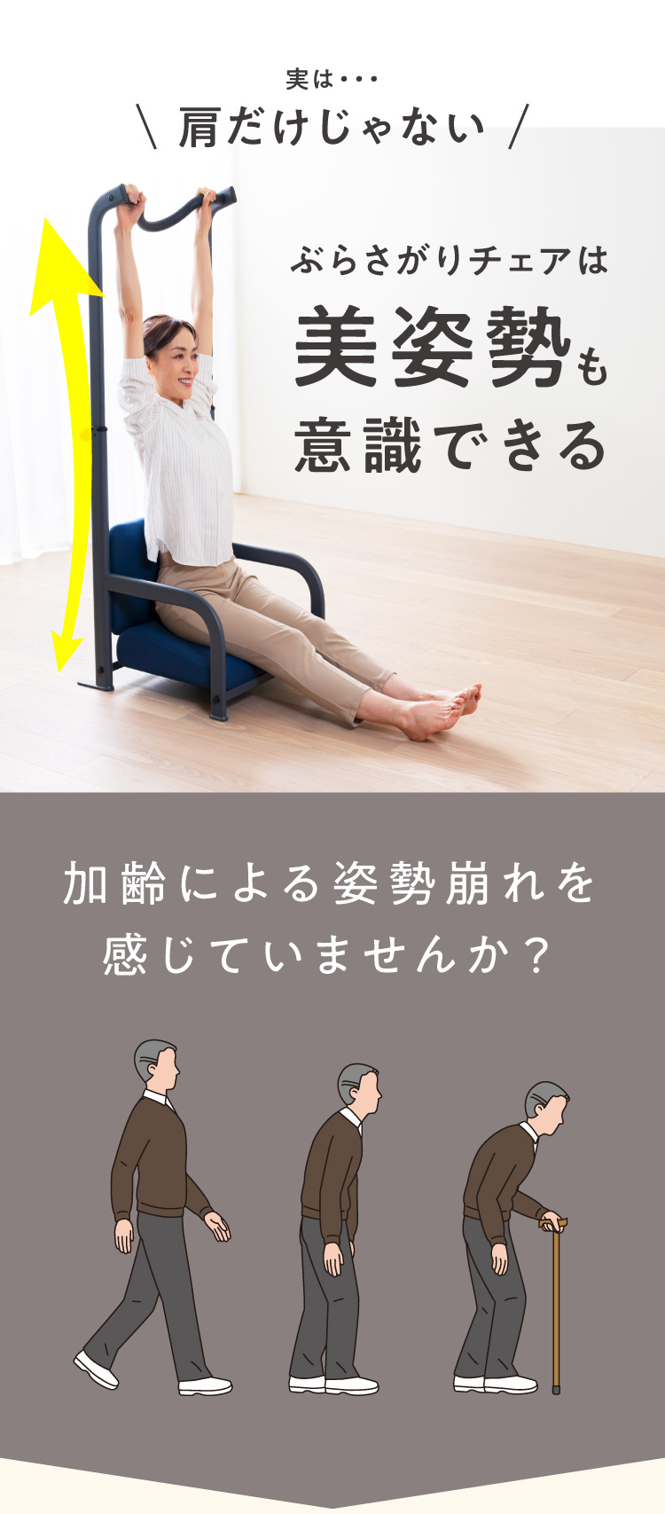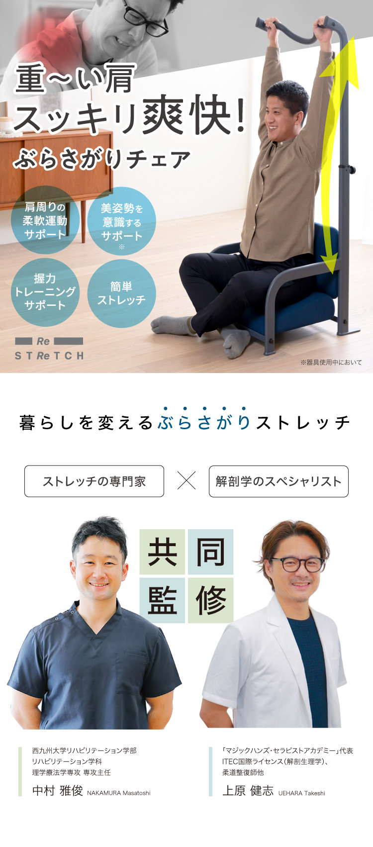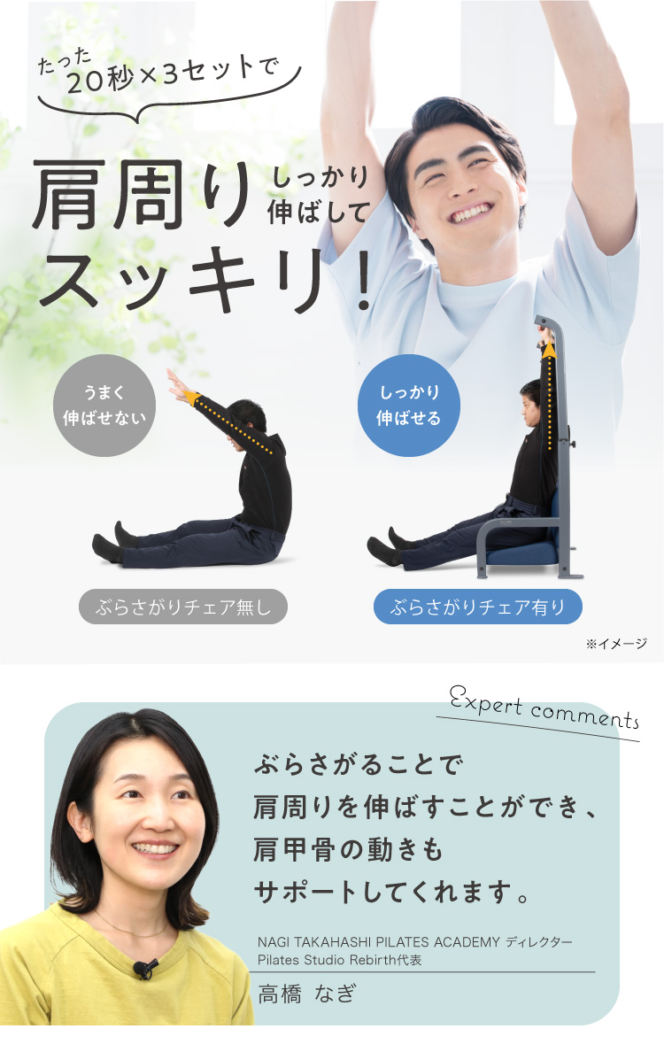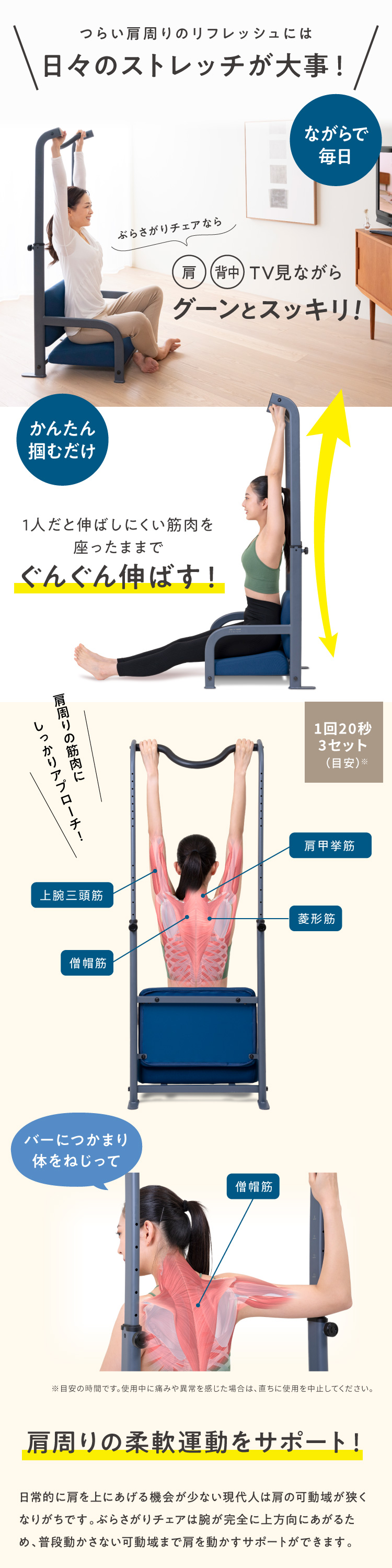 ぶらさがりチェアは腕が完全に上方向にあがるため、普段動かさない可動域まで肩を動かすサポートができます。