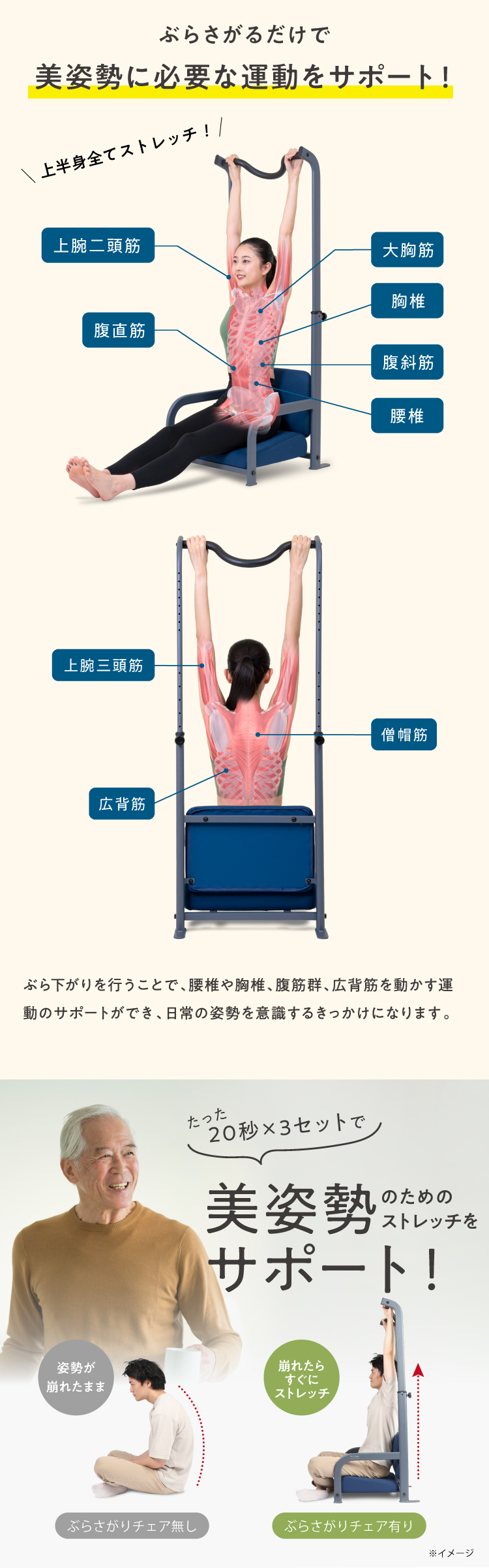 ぶら下がりを行うことで腰椎や胸椎、広背筋を動かす運動のサポートができるため、美姿勢な身体つきを後押しすることができます。