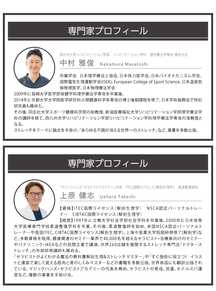 「ストレッチ論文数、世界1位」の中村雅俊先生と「解剖学×柔道整復師」の上原健志先生が監修!