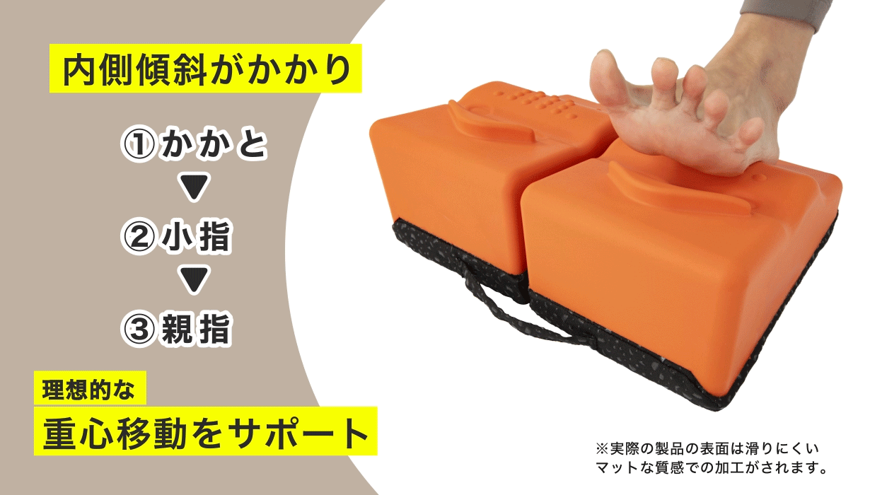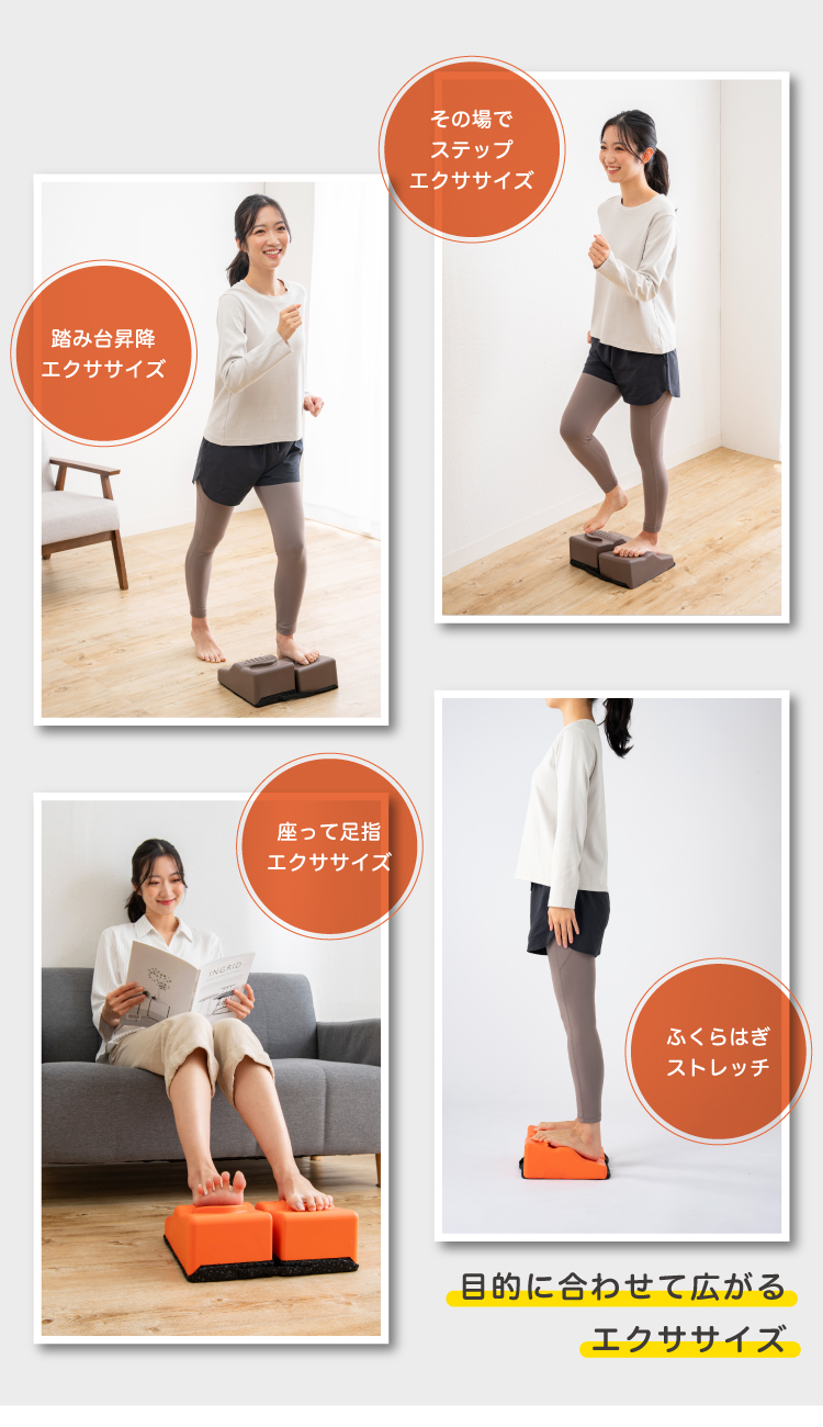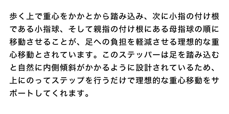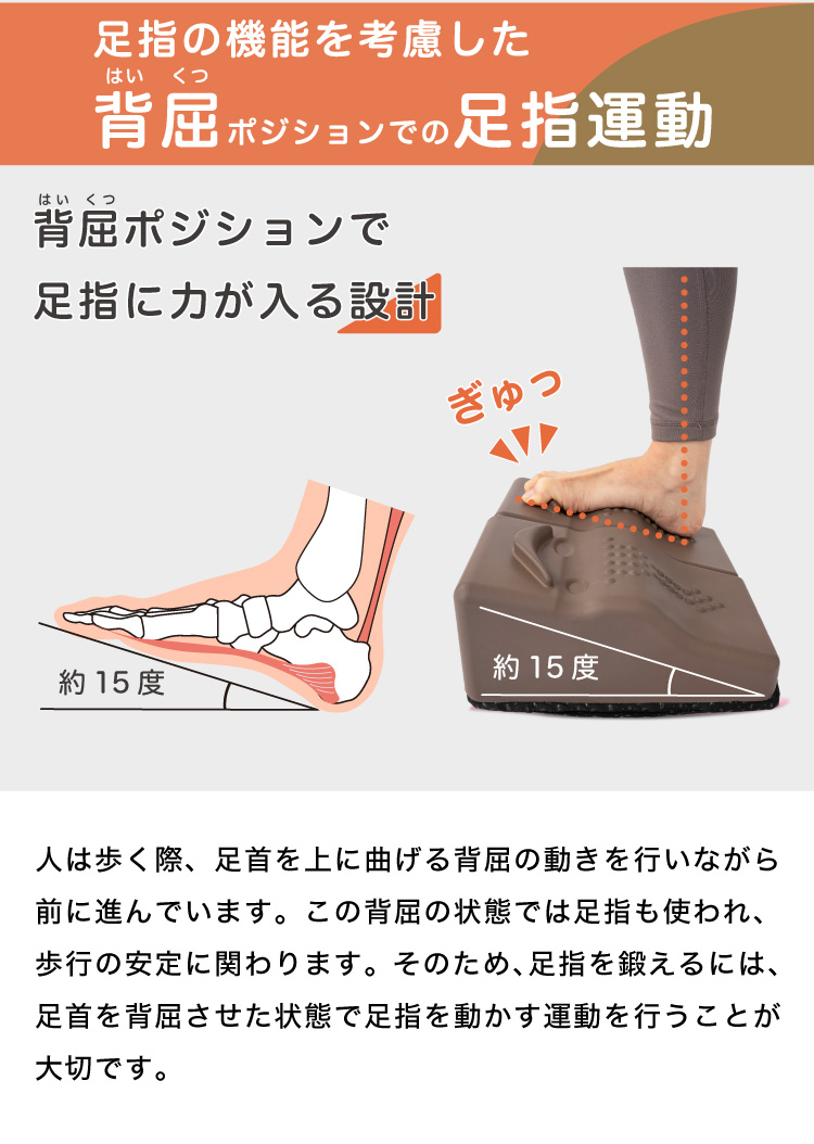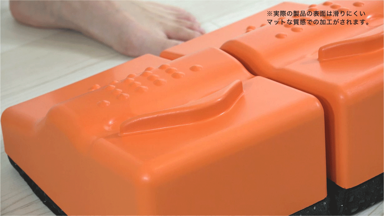 ステッパーに昇り降りするだけで、表面のグリップ突起と傾斜、そして踏み込みクッションにより自然と足指に力が入り、効率的に鍛えられるように設計されています。