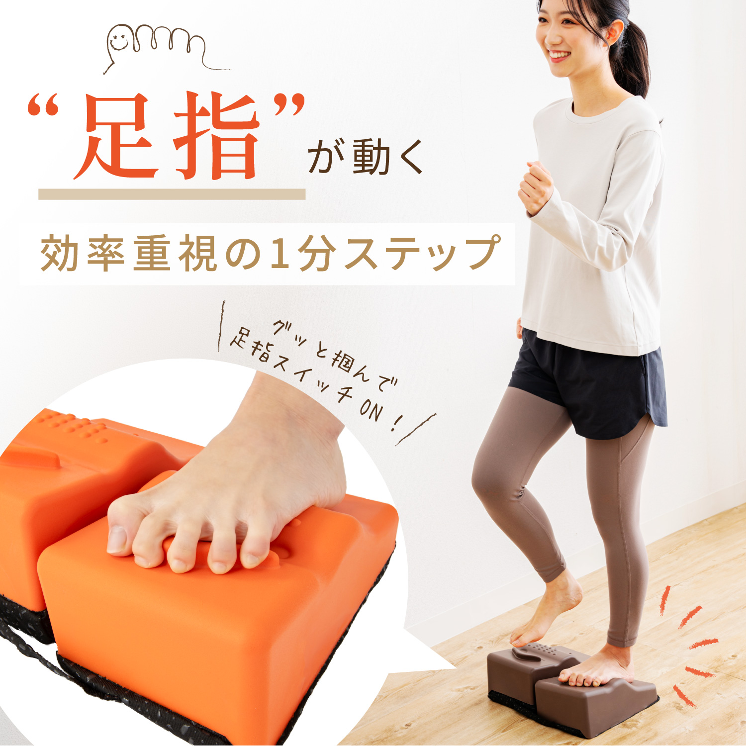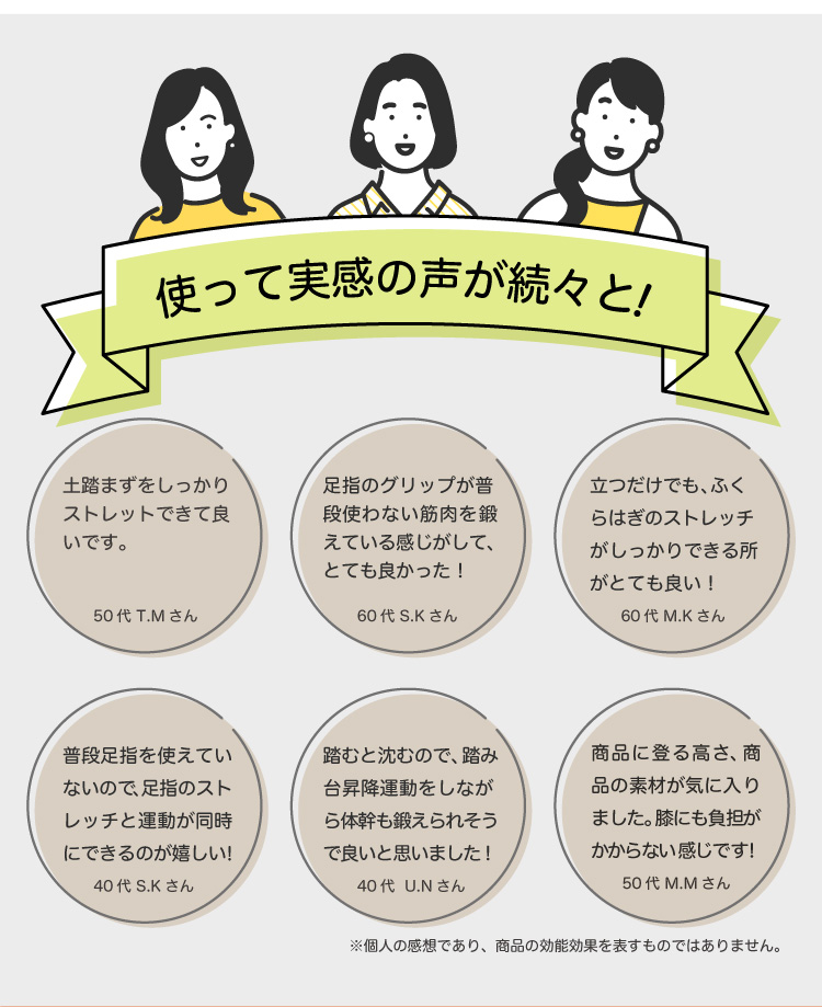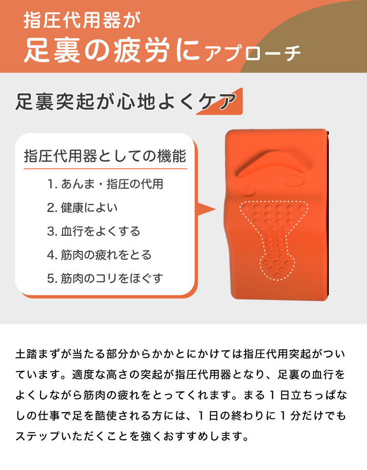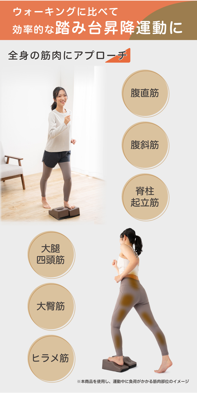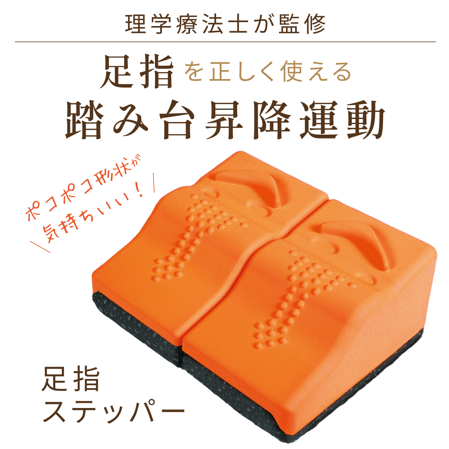 ステッパーに昇り降りするだけで、表面のグリップ突起と傾斜、そして踏み込みクッションにより自然と足指に力が入り、効率的に鍛えられるように設計されています。
