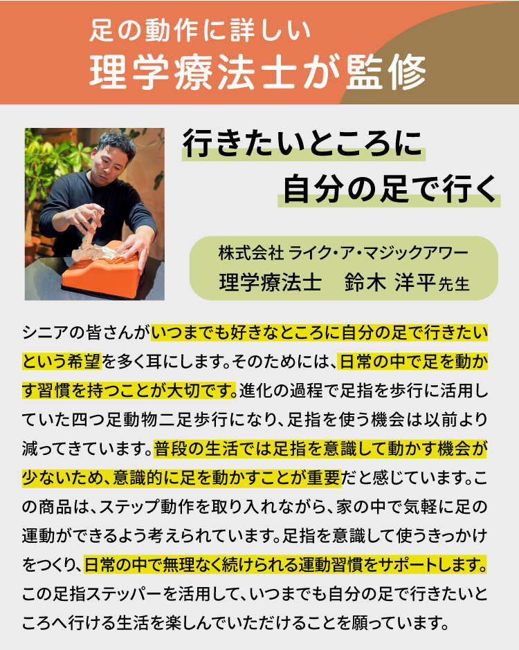 自分の足で元気に旅行を続けらられるためには?という観点から足指に着目したステッパーを監修いただきました。
