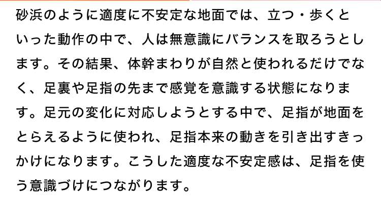足を踏み込むと、まるで砂浜の上を歩いているような「むぎゅっ」とした感触とともに、足裏の土踏まずを心地よく押してくれます。