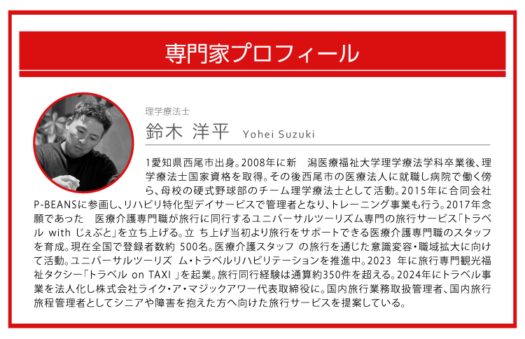 商品を監修したのは理学療法士で、主にシニアや障がい者の旅行支援を行う鈴木洋平さん。