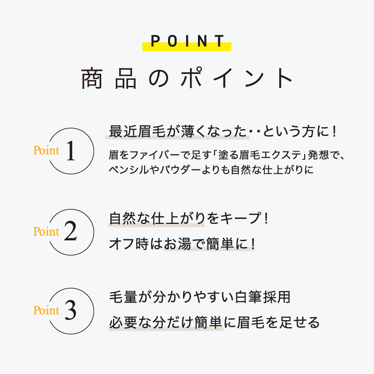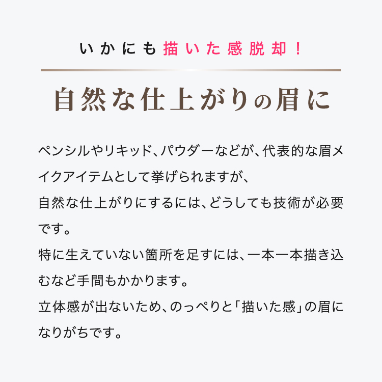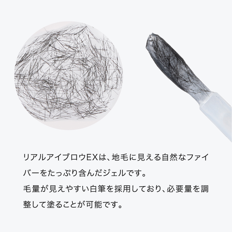 たっぷりのファイバーを、眉毛の足りない部分に直接塗るだけで、まるで生えているかのような自然な眉毛に仕上げられます。