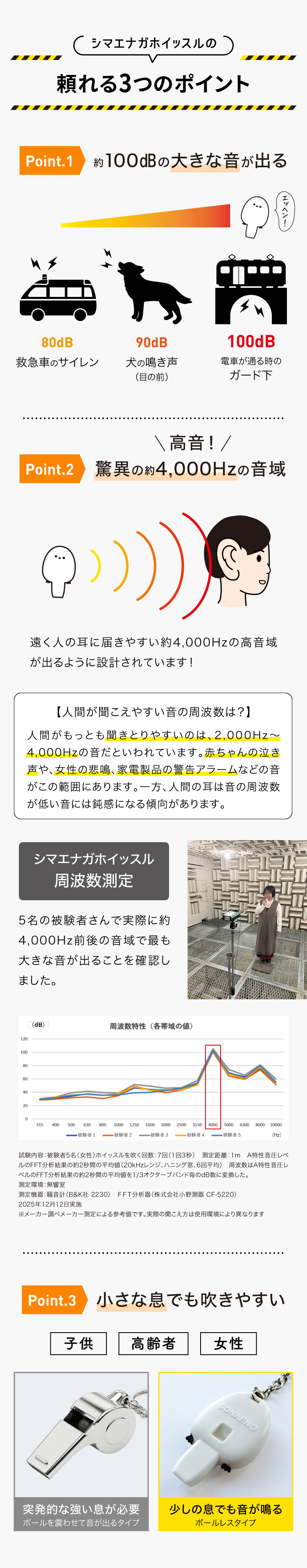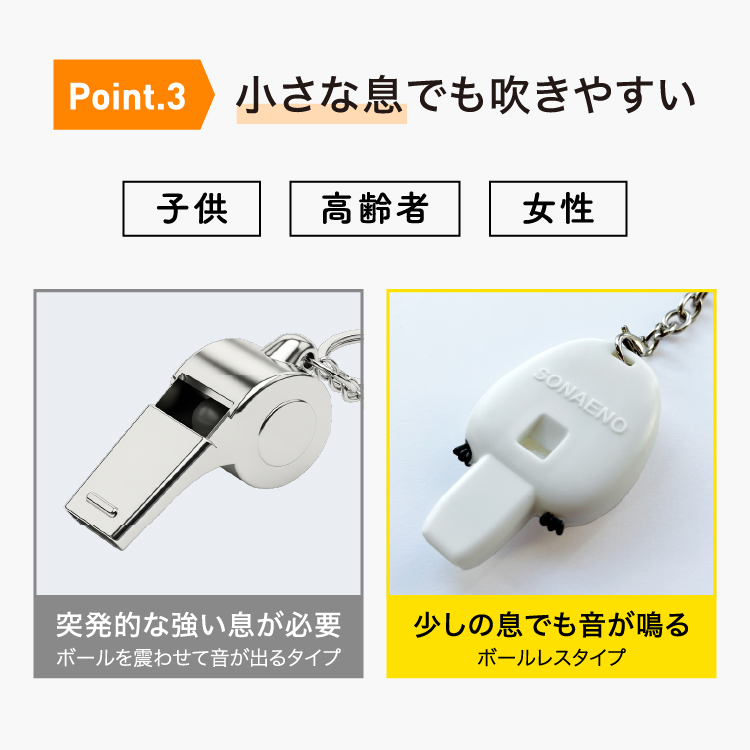 100dbと大きく、約4,000Hzと聞き取りやすい高さの音が出る防災用ホイッスルです。