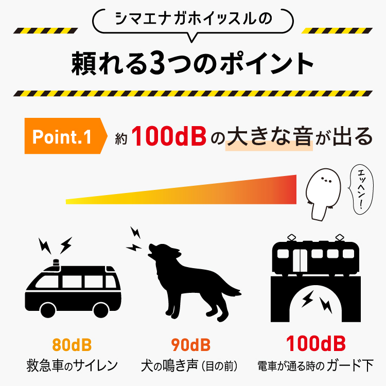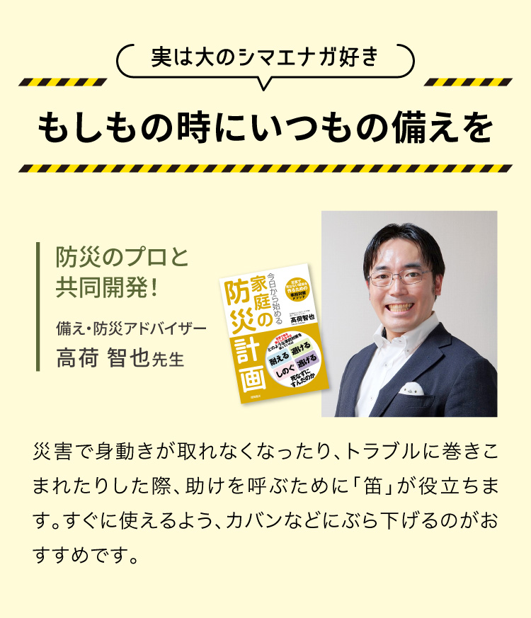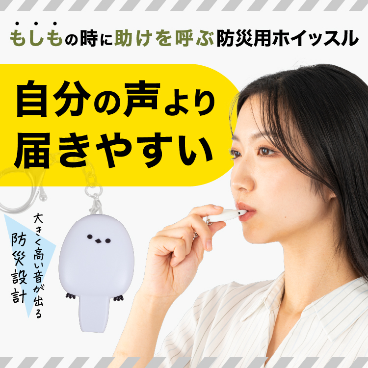 スマホや鞄のキーホルダーとして普段から身に着け、いざという時は尻尾を吹いて体力を温存しながら助けを求めましょう。