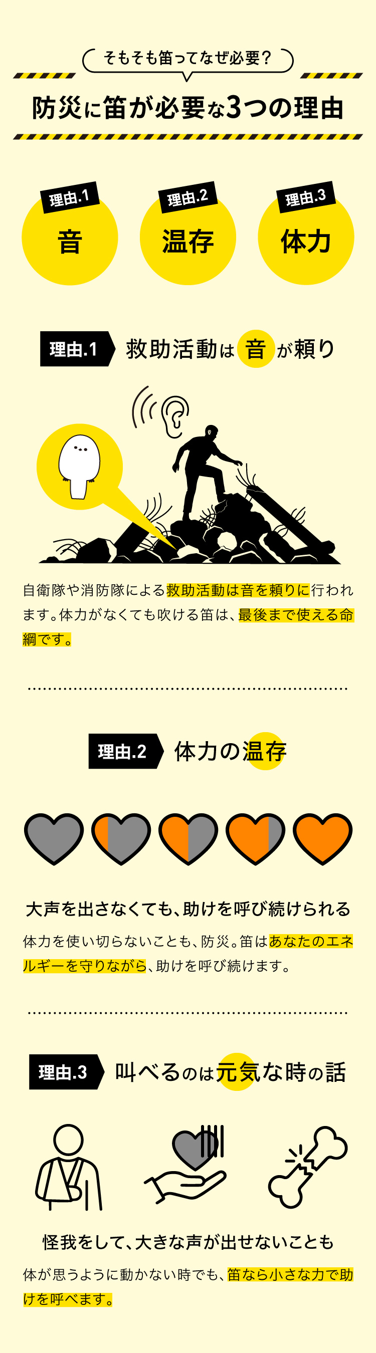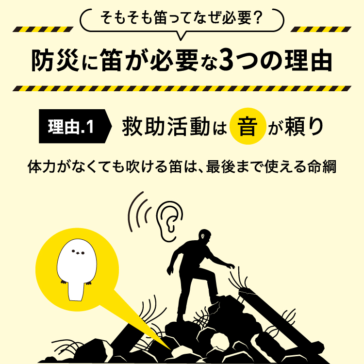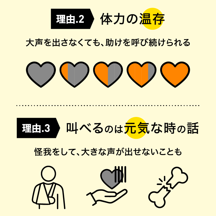 地震や大洪水で瓦礫の下に閉じ込められてしまった時、怪我をしていると大声が出せない可能性もあります。
