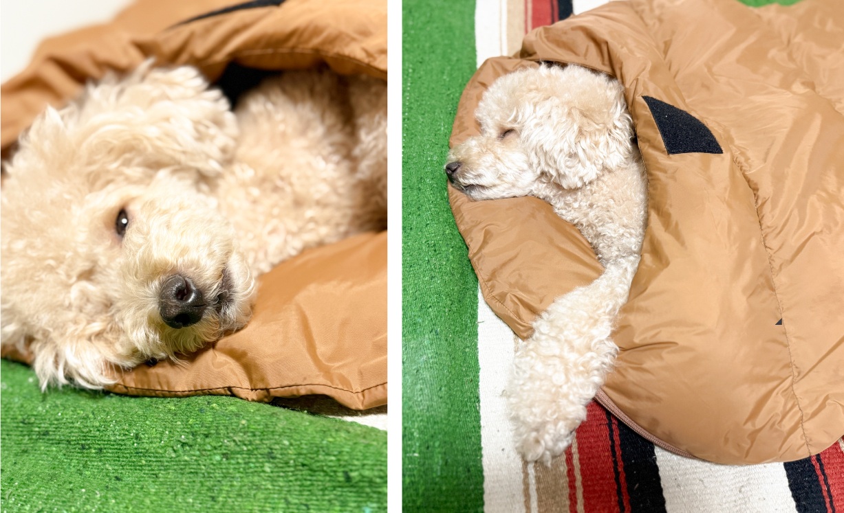 犬は寒さに強いといっても、気温の下がる夜中や冬場は人間と同じように寒さを感じるもの。シュラフを寝床にすることで朝まで暖かく心地良い環境をつくってあげることができます。